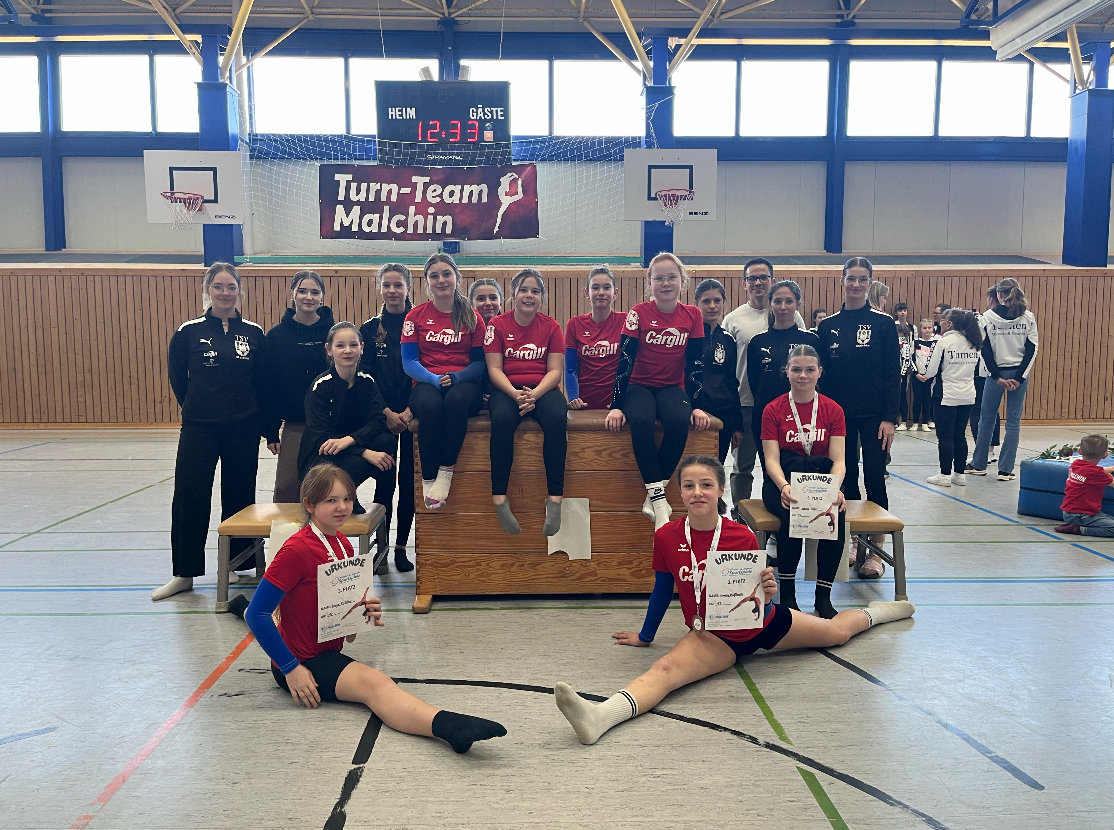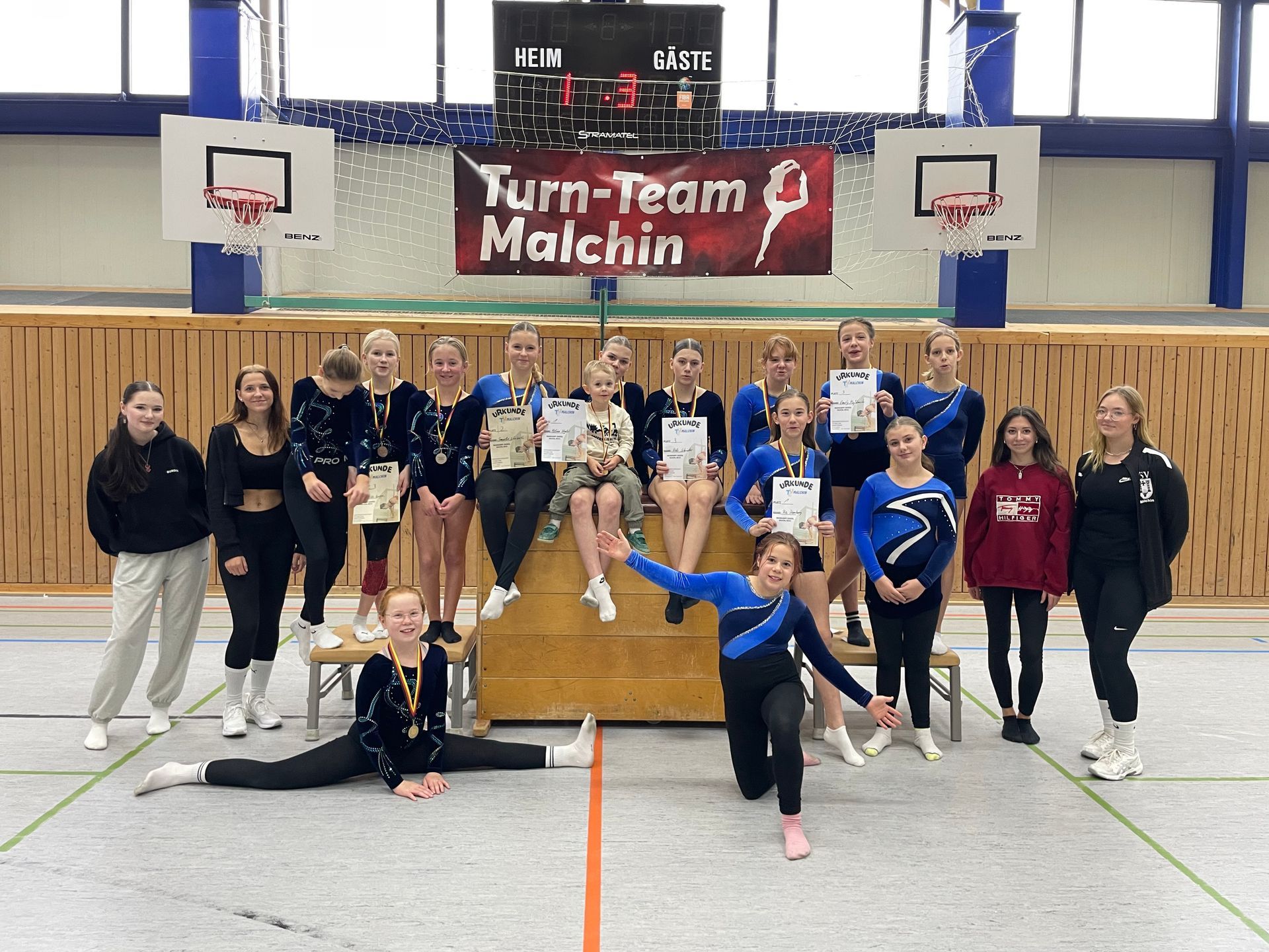Am 21.3.2025 fand der alljährliche Turnwettkampf des Schulcampus‘ Röbel statt, der einen festen Platz im Terminkalender unserer TSV-Turnerinnen hat. Dieser Schulwettkampf ist stets ein gut organisierter Einstieg in das Wettkampfjahr. Seit diesem Jahr wird der Wettkampf nach dem Regelwerk des Turn 10-Programms gewertet. Bei diesem Wertungsmodus werden aus einem Elementekatalog bis zu 10 Turnelemente zu einer Kür zusammengefügt. Für die Haltung, Technik und Dynamik wird zudem eine B-Note vergeben. Die Mädchen wählen aus den vier Geräten drei aus, an denen sie ihre Übungen zeigen. In diesem Jahr waren das die Geräte Boden, Schwebebalken, Reck/Stufenbarren und Sprung. Unsere Region war in diesem Jahr mit 15 Mädchen vom Fritz-Greve-Gymnasium, der Regionalen Schule „Siegfried Marcus“, dem Reuterstädter Schulcampus und der Benjamin-Schule Remplin vertreten. Einige sammelten hier ihre ersten Wettkampferfahrungen. Bei über 100 Teilnehmern gelang es den Mädchen, die alle im TSV Malchin trainieren, 5 Podestplatzierungen zu erreichen. Lucy Last gewann in der AK 18, Johanna Andrys und Johanna Funke erturnten sich in den Altersklassen 15 und 13 die Silbermedaille. Helena Ludwigs (AK14) und Henriette Hagge (AK 13) konnten eine Bronzemedaille mit nach Hause nehmen. Mit dieser Ausbeute kann man zufrieden sein. Zwei vierte Plätze und viele weitere gute Leistungen lassen auf ein noch besseres Abschneiden im kommenden Jahr hoffen.