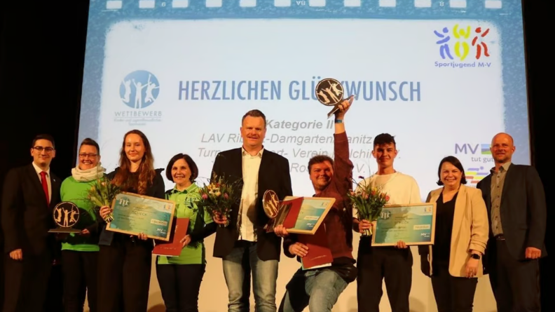 Das ist das Ding! Michael Großmann (Vierter von rechts) freute sich riesig über den zweiten Platz des TSV Malchin. (Foto: Maik Werner) Der Turn- und Sportverein Malchin hatte in Schwerin seinen großen Auftritt, als er für sein Engagement für den Nachwuchs ausgezeichnet wurde. Der TSV Malchin hatte kürzlich allen Grund zur Freude. Auszeichnung des TSV Malchin fand im Schweriner Capitol statt Im Schweriner Capitol wurden nämlich die Förderpreise des Landes Mecklenburg-Vorpommern im Wettbewerb kinder- und jugendfreundlicher Sportverein verliehen. Dieser wurde in Gemeinschaft mit dem Land M-V und dem Landessportbund vergeben. In der Kategorie II, den Sportvereinen zwischen 150 und 500 Mitgliedern, landete der Turn- und Sportverein Malchin für das Jahr 2023 auf Rang zwei. Sport-Ministerin Stefanie Drese überreichte den Preis an Michael Großmann vom TSV Malchin Michael Großmann nahm als stellvertretender Vereinsvorsitzender den Preis aus den Händen der Ministerin für Soziales, Gesund und Sport M-V, Stefanie Drese, sowie von Theo Hadrath als 1. Vorsitzender der Sportjugend M-V im Landessportbund M-V voller Freude entgegen.