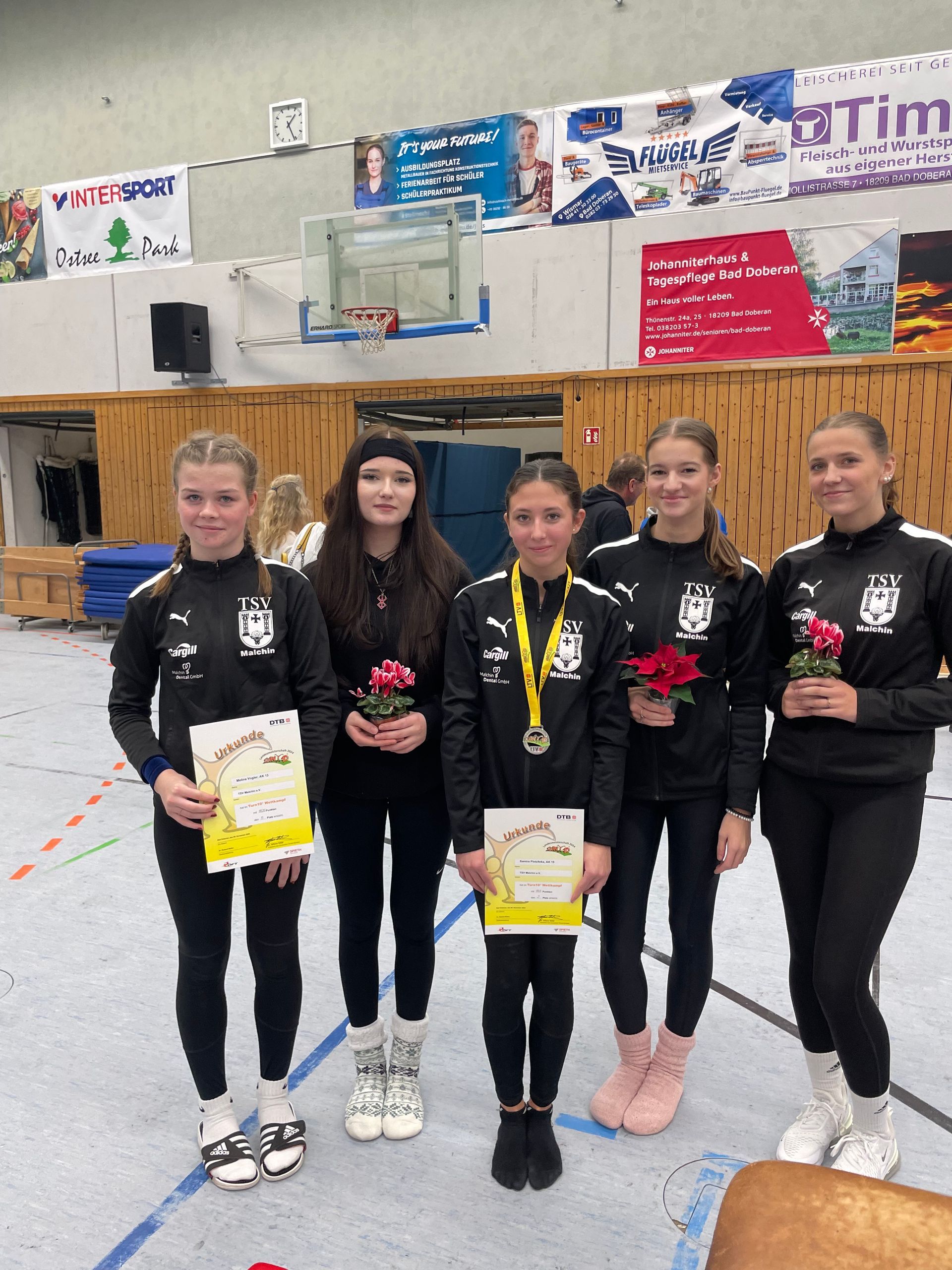 Am 21.3.2025 fand der alljährliche Turnwettkampf des Schulcampus‘ Röbel statt, der einen festen Platz im Terminkalender unserer TSV-Turnerinnen hat. Dieser Schulwettkampf ist stets ein gut organisierter Einstieg in das Wettkampfjahr. Seit diesem Jahr wird der Wettkampf nach dem Regelwerk des Turn 10-Programms gewertet. Bei diesem Wertungsmodus werden aus einem Elementekatalog bis zu 10 Turnelemente zu einer Kür zusammengefügt. Für die Haltung, Technik und Dynamik wird zudem eine B-Note vergeben. Die Mädchen wählen aus den vier Geräten drei aus, an denen sie ihre Übungen zeigen. In diesem Jahr waren das die Geräte Boden, Schwebebalken, Reck/Stufenbarren und Sprung. Unsere Region war in diesem Jahr mit 15 Mädchen vom Fritz-Greve-Gymnasium, der Regionalen Schule „Siegfried Marcus“, dem Reuterstädter Schulcampus und der Benjamin-Schule Remplin vertreten. Einige sammelten hier ihre ersten Wettkampferfahrungen. Bei über 100 Teilnehmern gelang es den Mädchen, die alle im TSV Malchin trainieren, 5 Podestplatzierungen zu erreichen. Lucy Last gewann in der AK 18, Johanna Andrys und Johanna Funke erturnten sich in den Altersklassen 15 und 13 die Silbermedaille. Helena Ludwigs (AK14) und Henriette Hagge (AK 13) konnten eine Bronzemedaille mit nach Hause nehmen. Mit dieser Ausbeute kann man zufrieden sein. Zwei vierte Plätze und viele weitere gute Leistungen lassen auf ein noch besseres Abschneiden im kommenden Jahr hoffen.